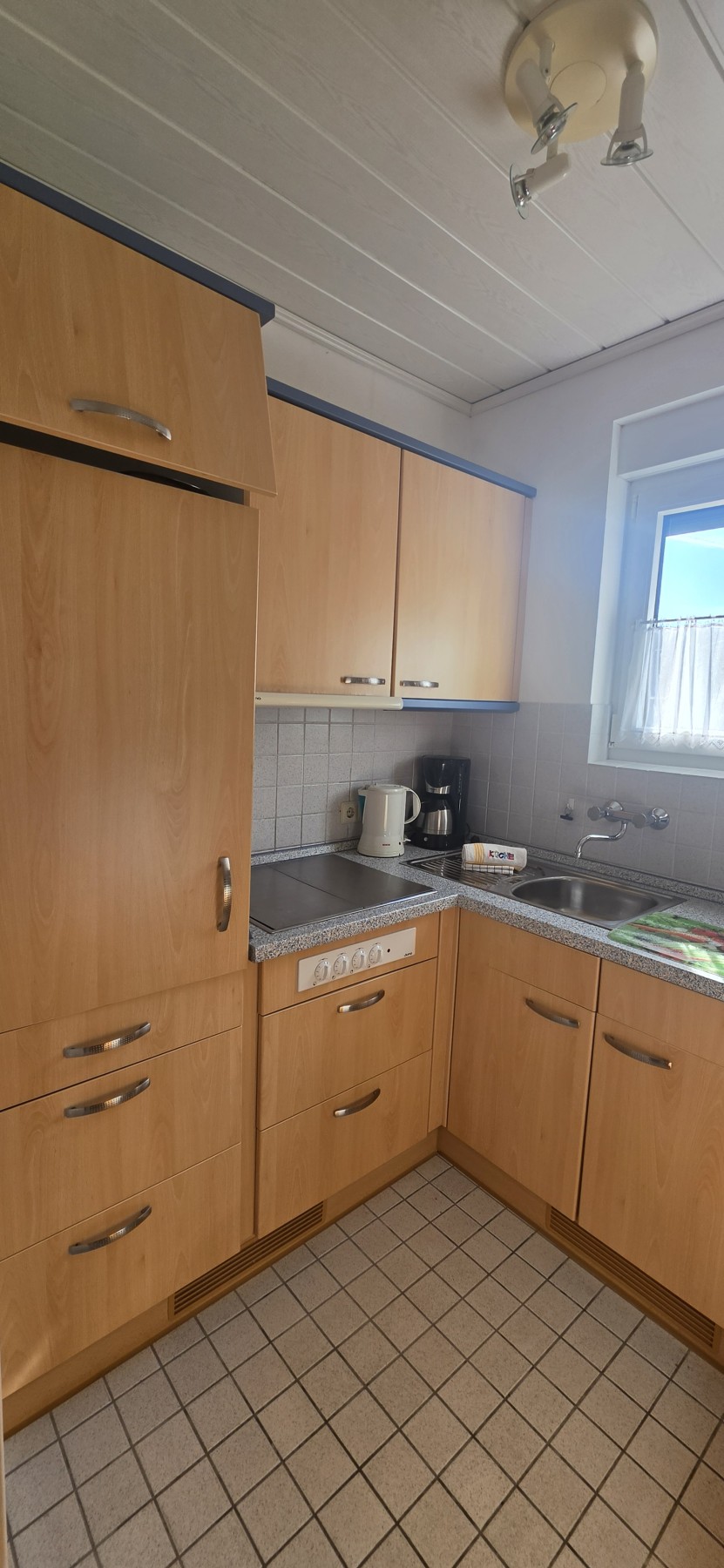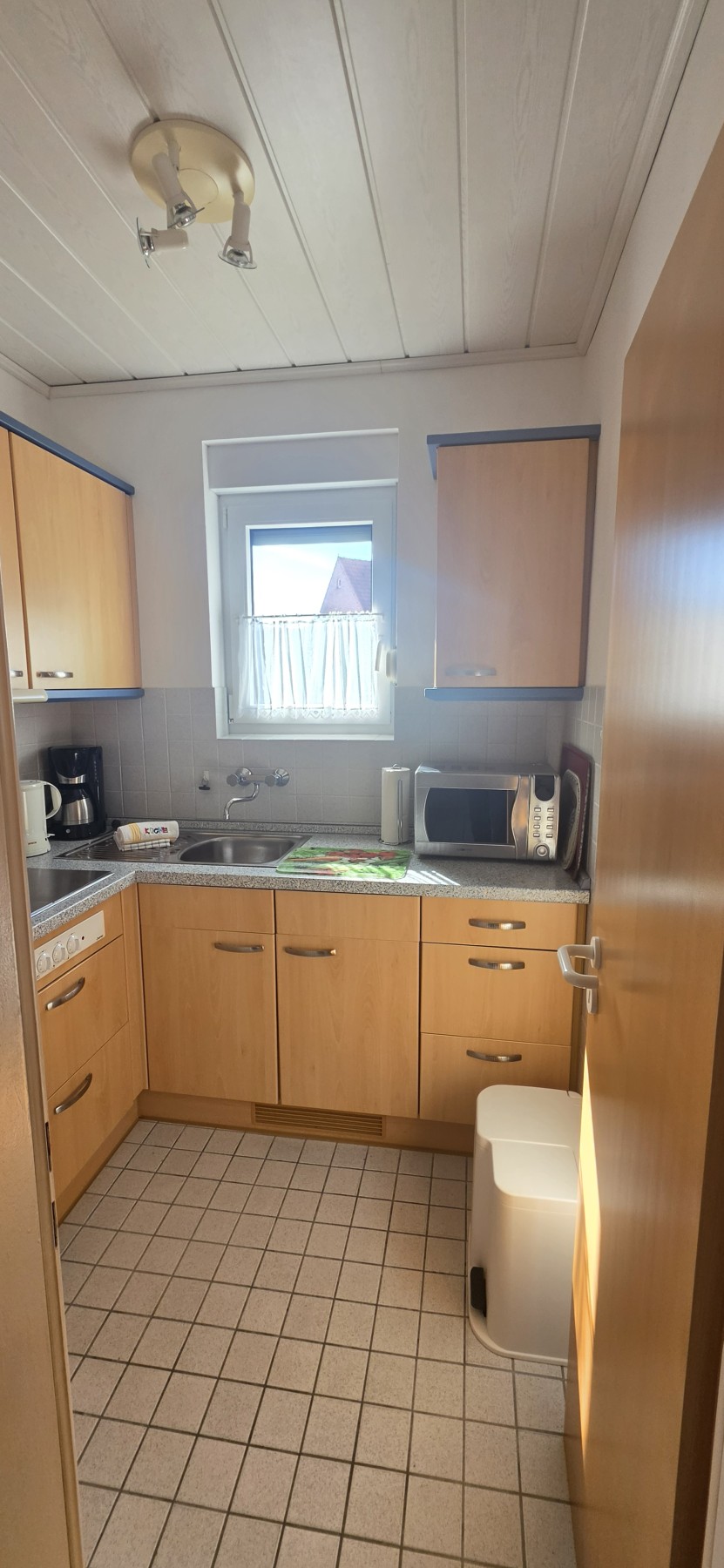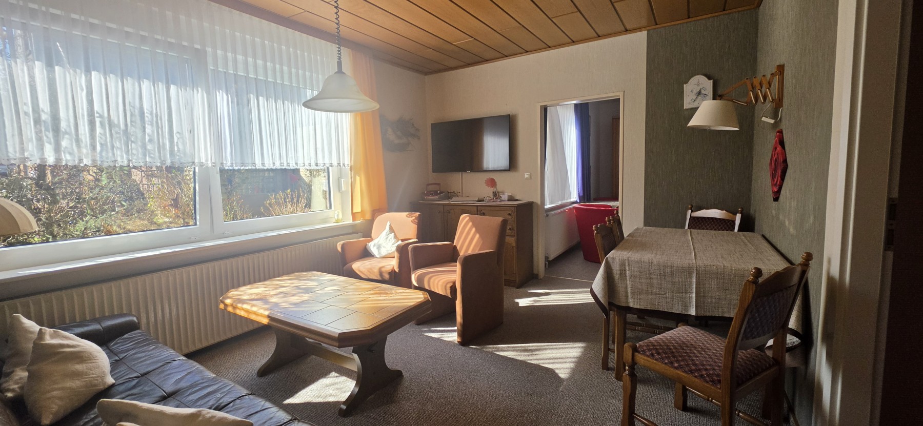 Das helle Wohnzimmer lädt mit TV-Anschluss und Radio zum Verweilen ein. Die separate Küche ist funktional eingerichtet und verfügt über ein Ceranfeld, eine Mikrowelle, einen Kühlschrank sowie eine Kaffeemaschine – perfekt für die Selbstversorgung während Ihres Aufenthalts.
