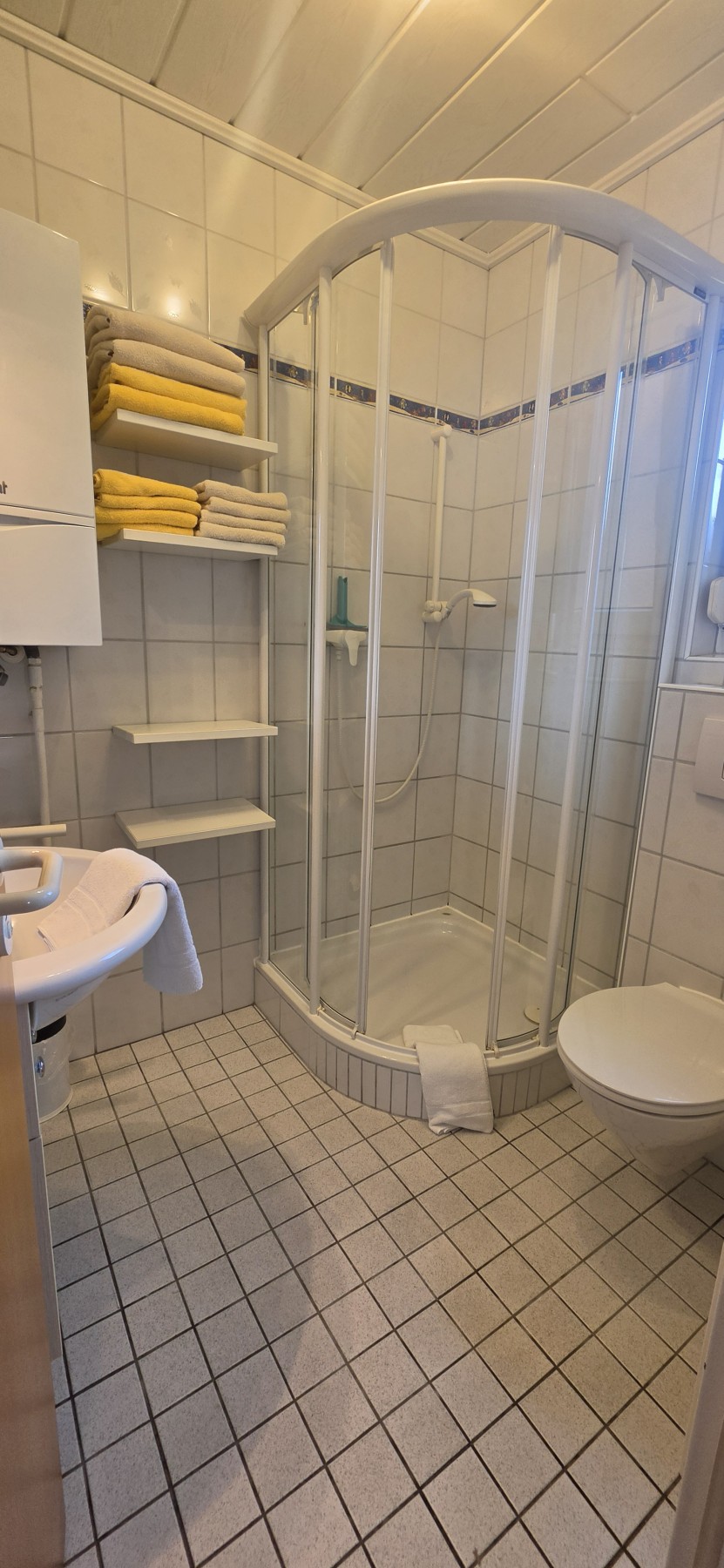 Das Badezimmer ist mit Toilette und Waschbecken ausgestattet.