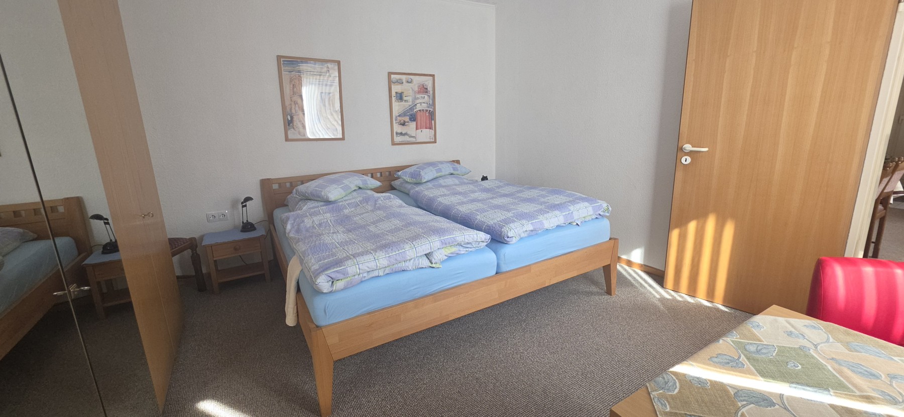Die Wohnung verfügt über zwei separate Schlafzimmer: Ein Schlafzimmer ist mit einem komfortablen Doppelbett ausgestattet, während das zweite Schlafzimmer zwei Einzelbetten bietet. So genießen alle Gäste ausreichend Privatsphäre und erholsame Nächte.