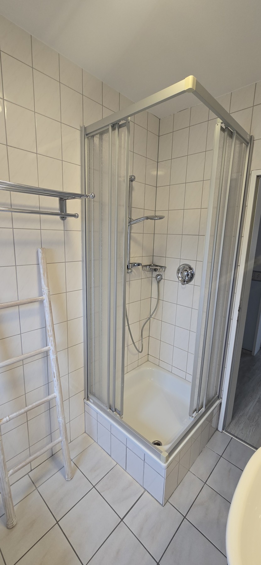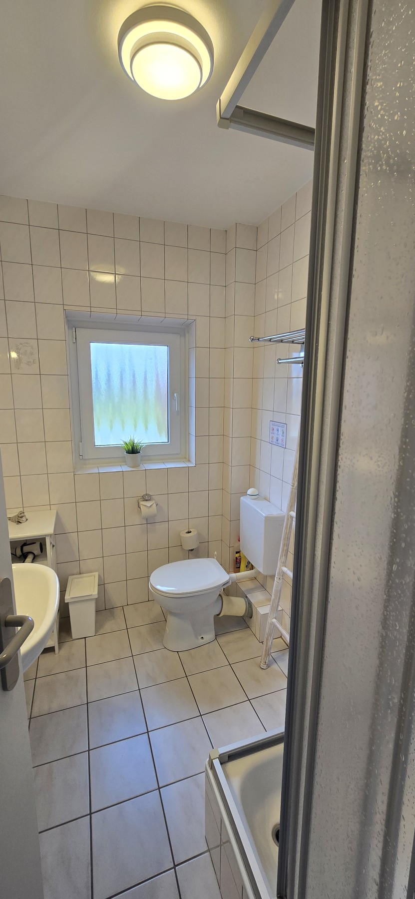 Das Badezimmer verfügt über eine Dusche, Waschbecken sowie ein WC.