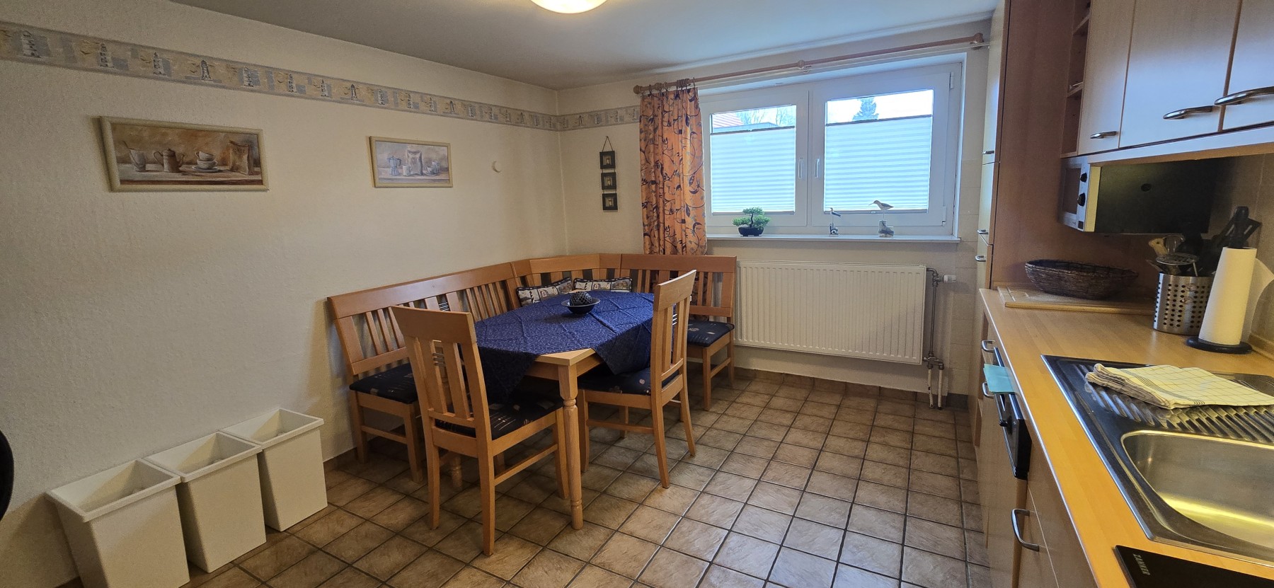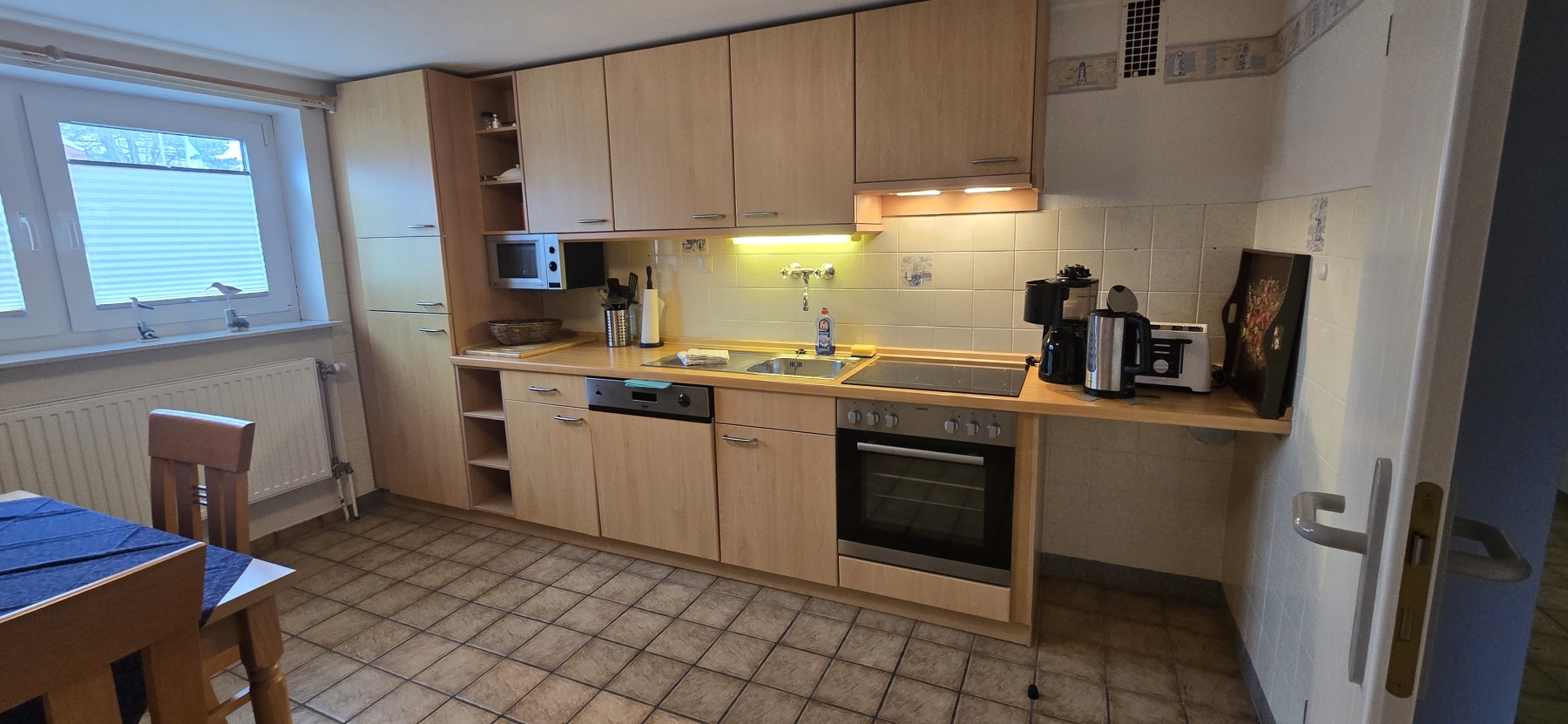 Die separate Küche ist voll ausgestattet und bietet einen gemütlichen Esstisch für gemeinsame Mahlzeiten.