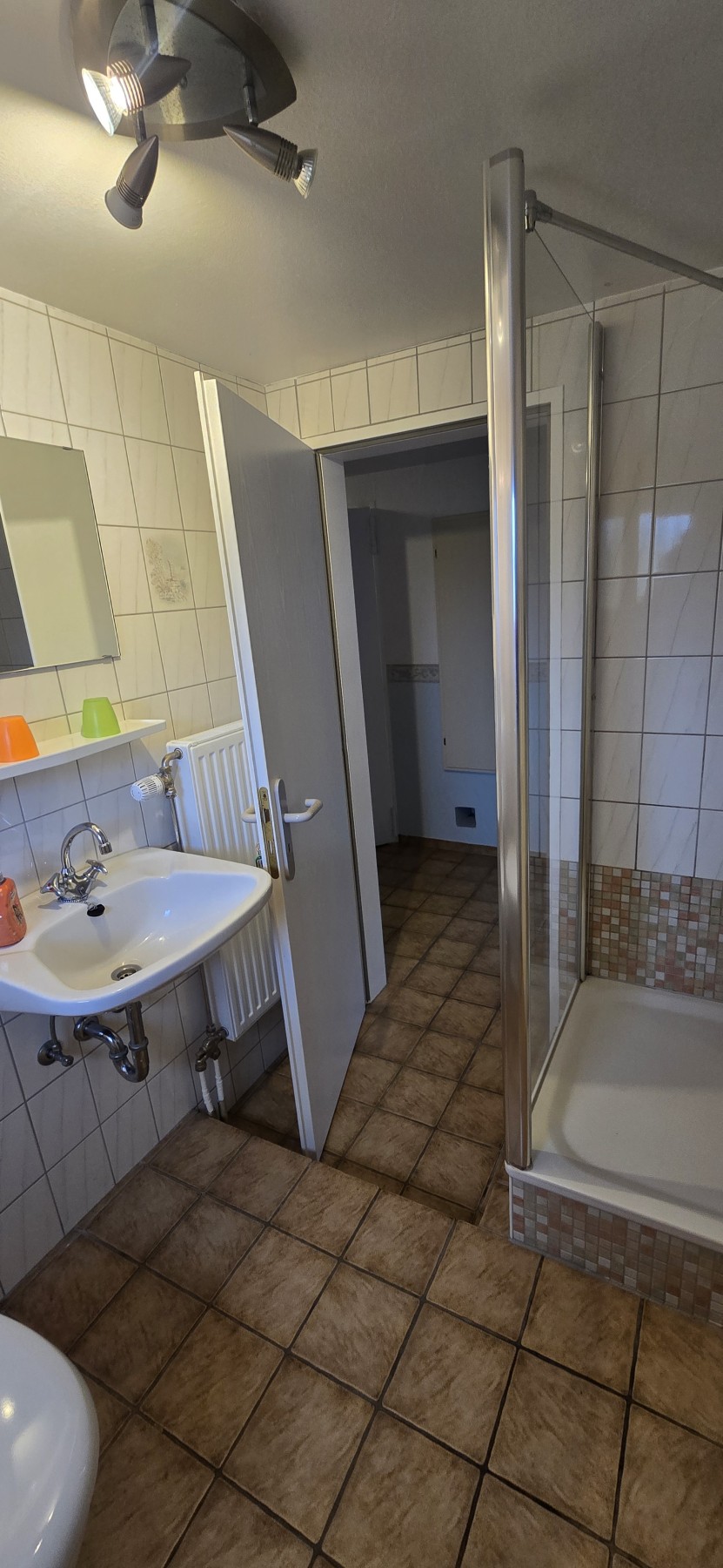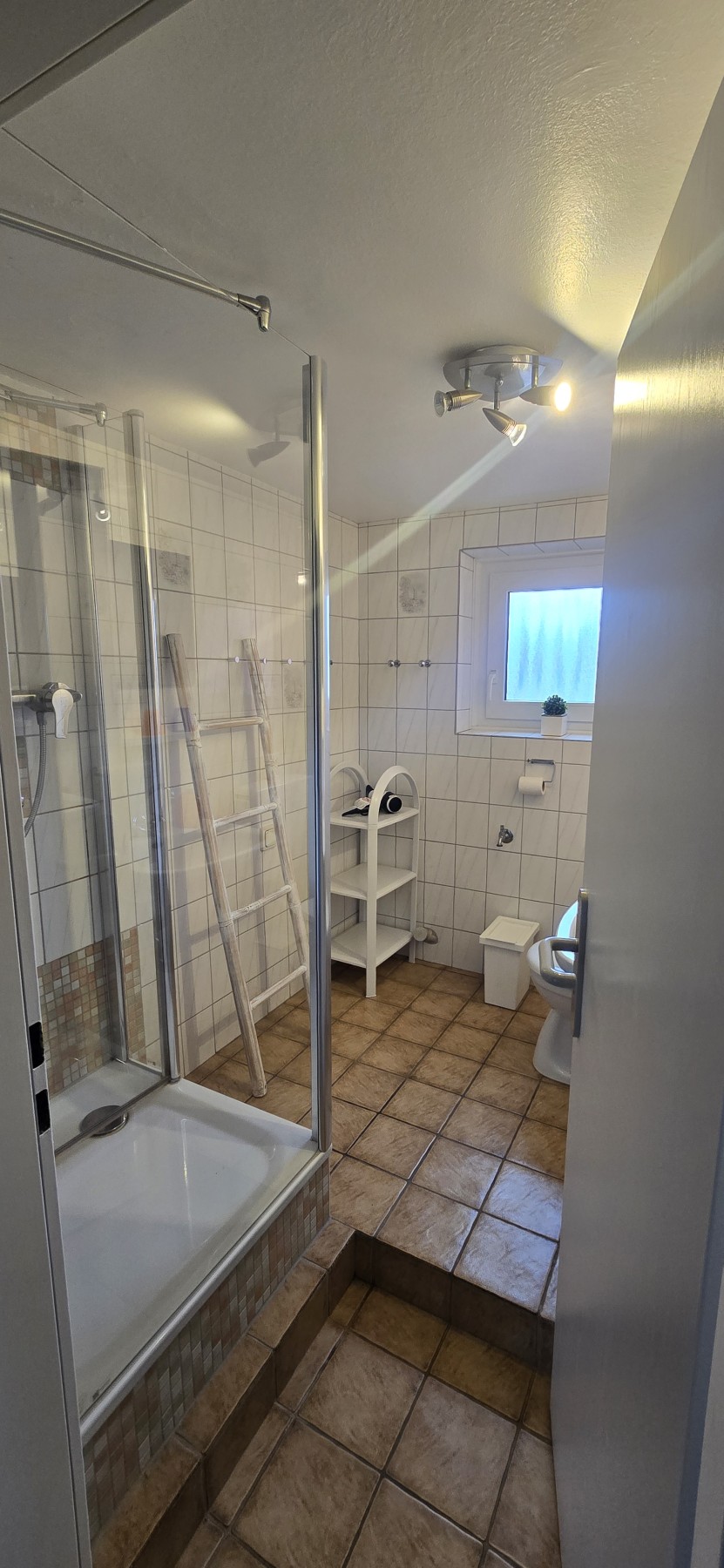 Das Badezimmer ist modern eingerichtet und verfügt über eine Dusche, ein Waschbecken und eine Toilette.