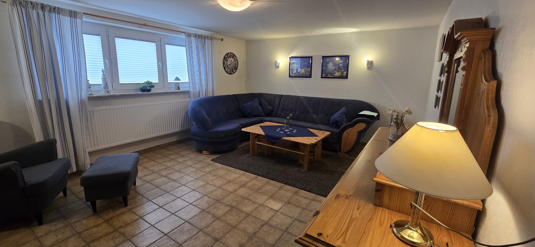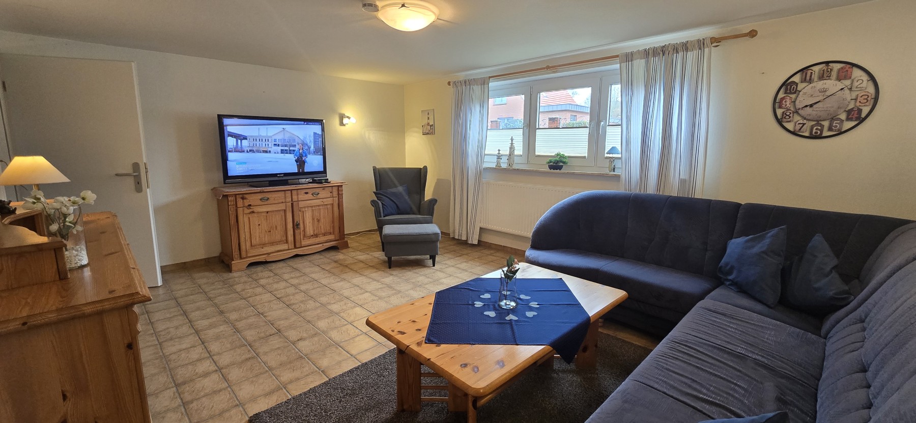 Das große Wohnzimmer lädt zum Verweilen ein und bietet zusätzlich ein Sofa sowie einen großen Fernseher.