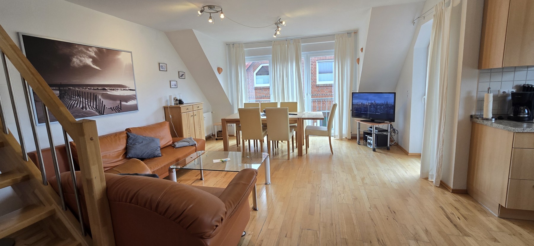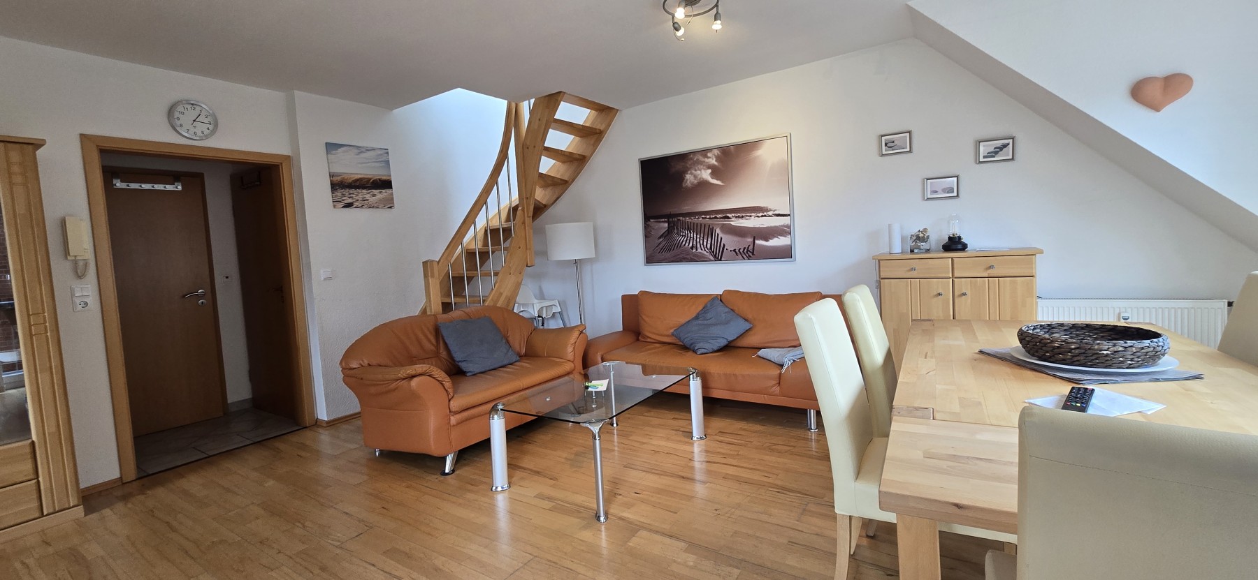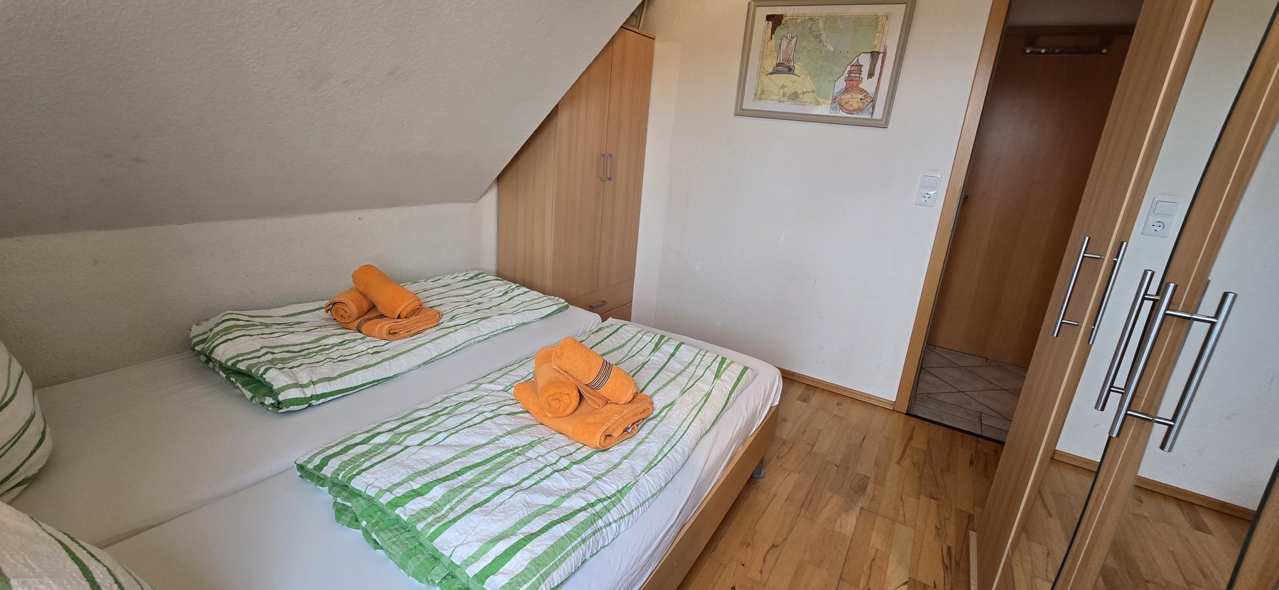 4 Personen finden ausreichend Platz aufzwei Etagen in dieser Ferienwohnung. Die Wohnung befindet sich in derersten Etage und verfügt übereinen großzügigen Balkon. In der unteren Etage befindet sich dasgeräumige Wohnzimmer mit Küchenzeile und Essecke, ein Schlafzimmer, undBadezimmer. In der oberen Etage unter dem Dach befindet sich einweiteres Schlafzimmer und ein WC. Backofen, Mikrowelle, Kabel-TV,DVD-Player, Stereo-Anlage, TV im Dachgeschoss und Waschmaschine gehörenzur Ausstattung.