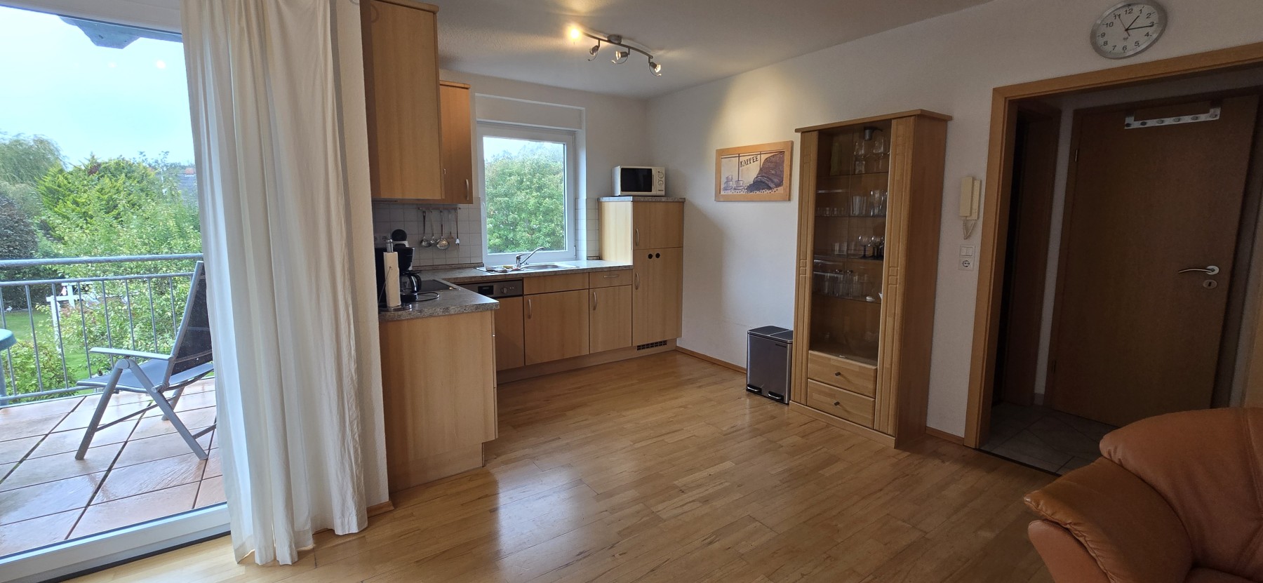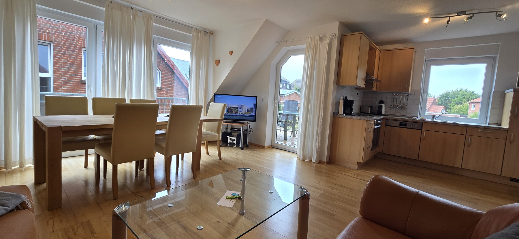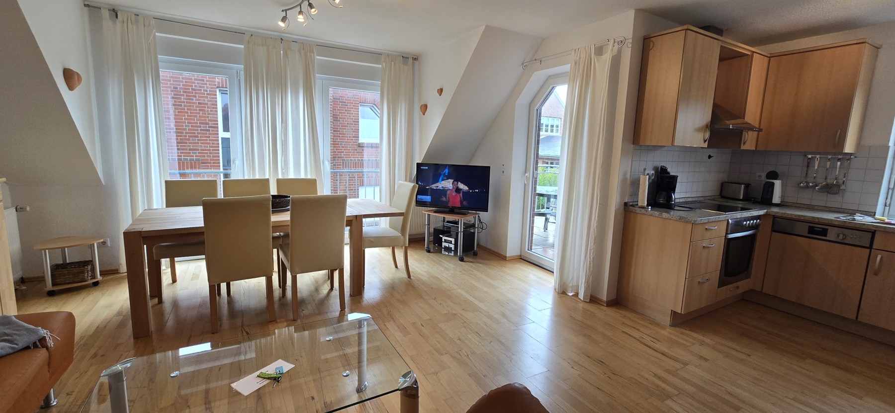 4 Personen finden ausreichend Platz aufzwei Etagen in dieser Ferienwohnung. Die Wohnung befindet sich in derersten Etage und verfügt übereinen großzügigen Balkon. In der unteren Etage befindet sich dasgeräumige Wohnzimmer mit Küchenzeile und Essecke, ein Schlafzimmer, undBadezimmer. In der oberen Etage unter dem Dach befindet sich einweiteres Schlafzimmer und ein WC. Backofen, Mikrowelle, Kabel-TV,DVD-Player, Stereo-Anlage, TV im Dachgeschoss und Waschmaschine gehörenzur Ausstattung.