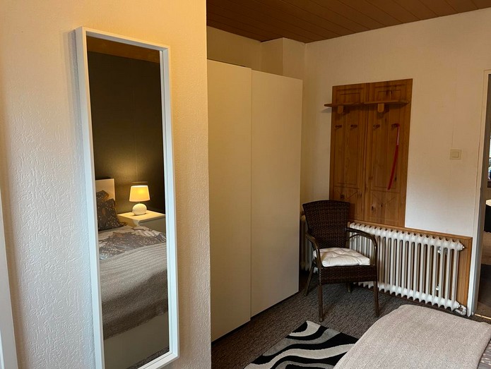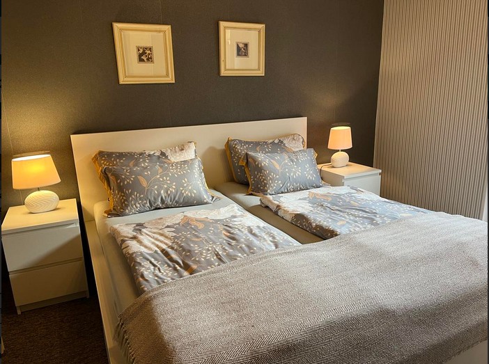 Das separate Schlafzimmer ist mit einem komfortablen Doppelbett ausgestattet. Das Badezimmer bietet eine Dusche und WC.