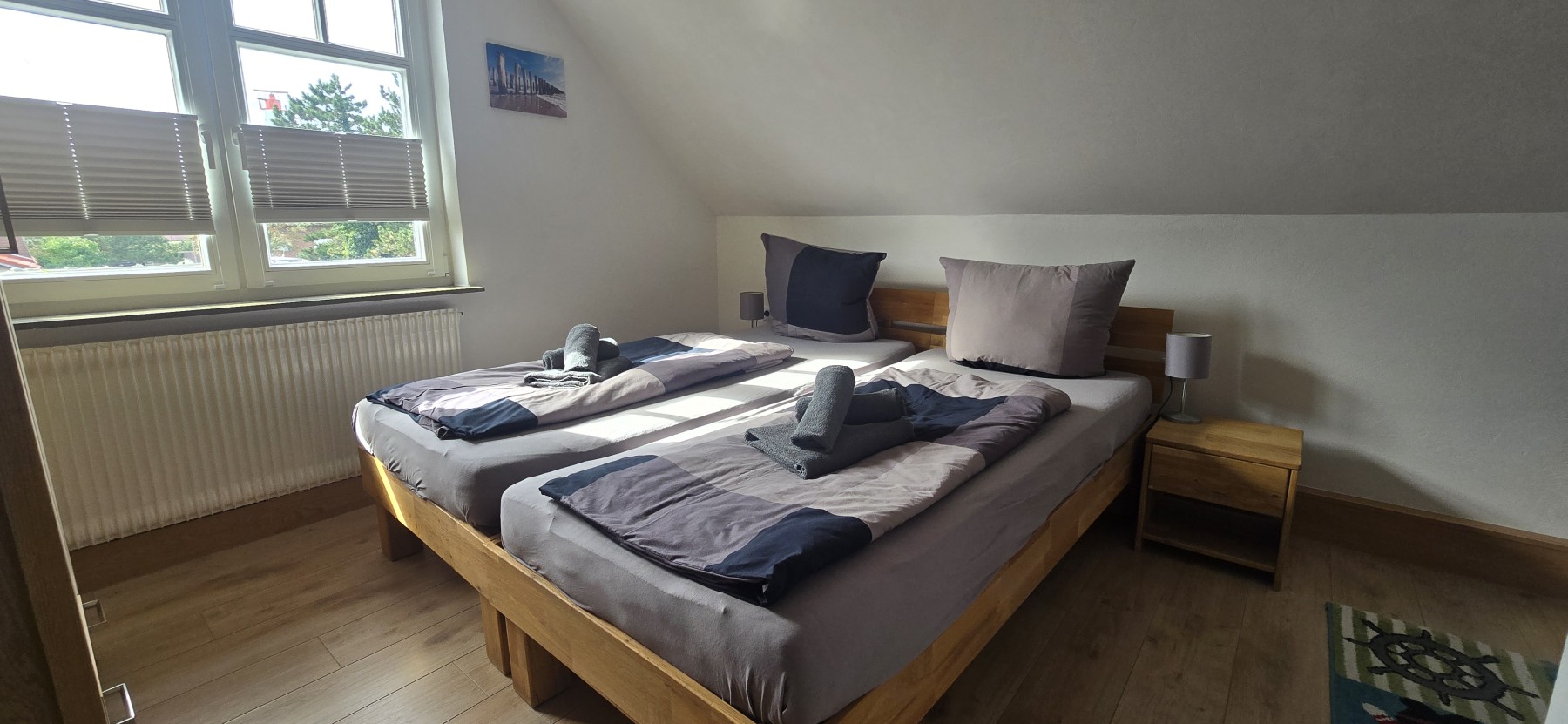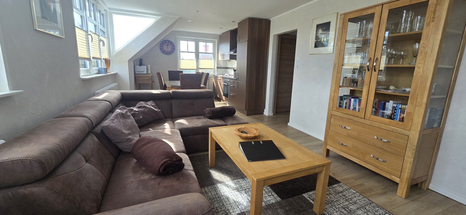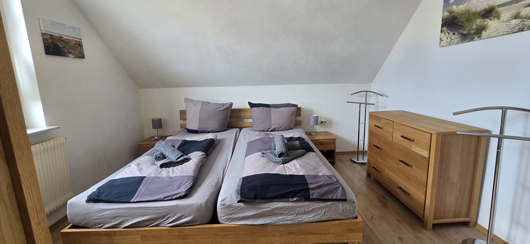 Die mit 80 m² etwas kleinere Wohnung im Obergeschoss verfügt über 2 Schlafzimmer sowie 2 Bäder und eine geräumige Wohn-Essküche mit Blick in die Dünen.