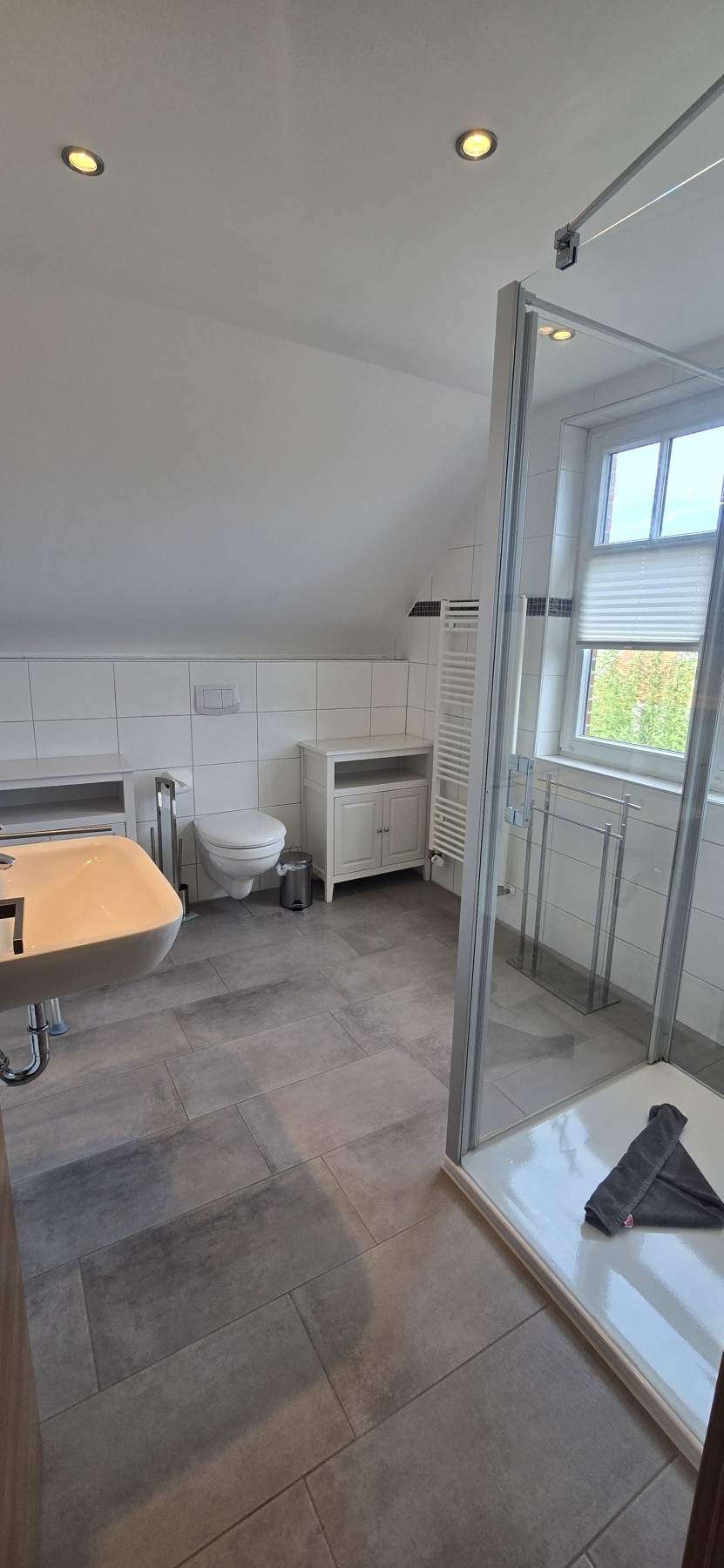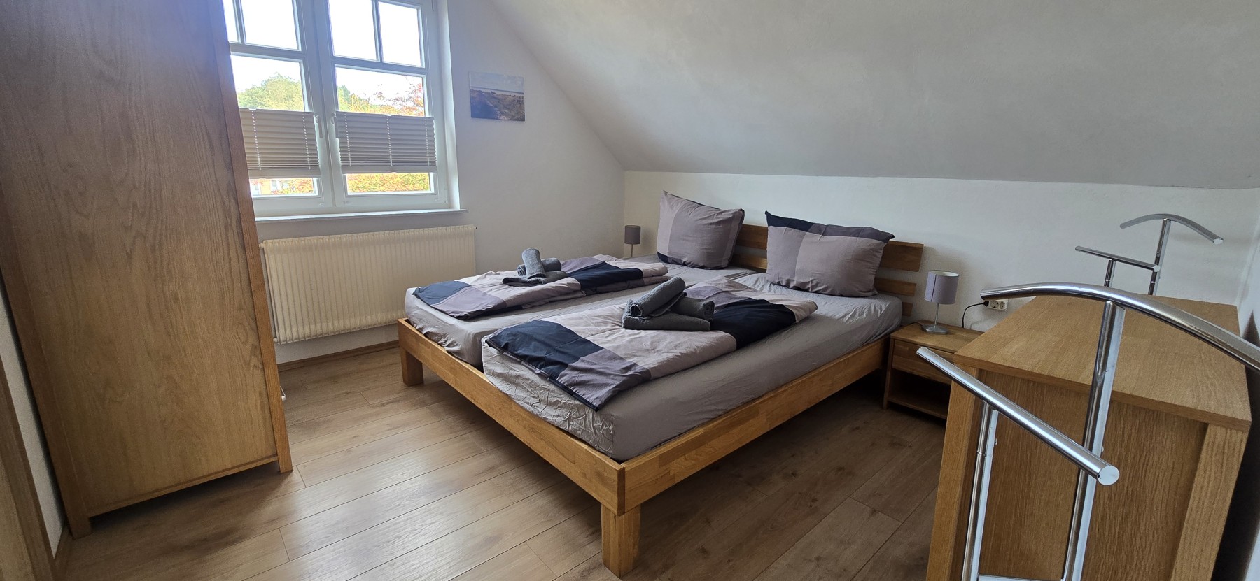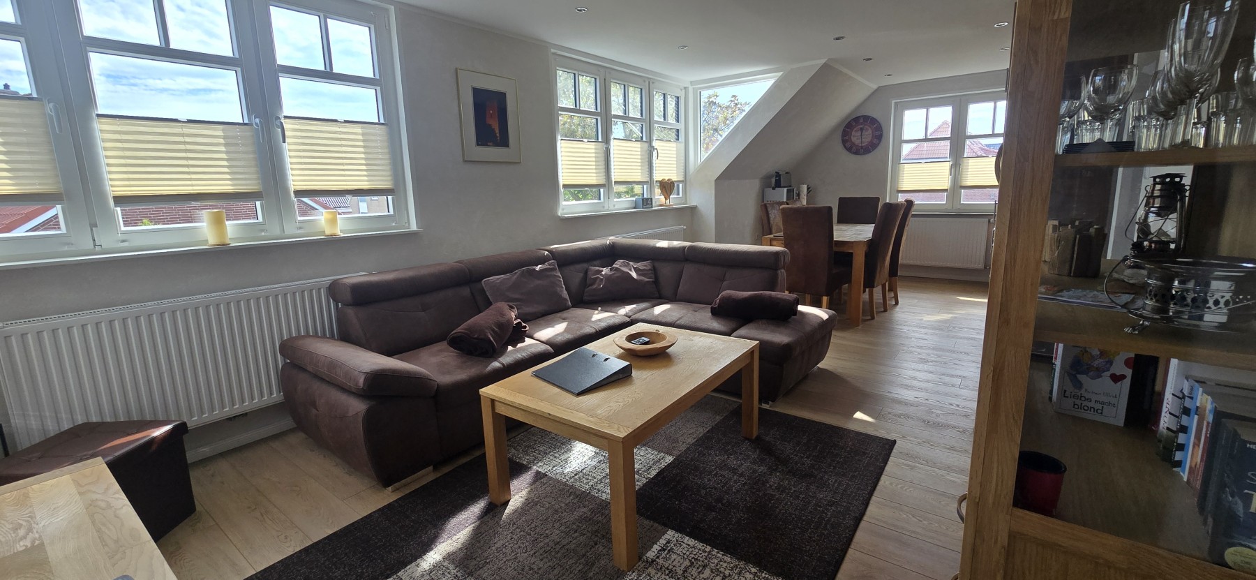 Die mit 80 m² etwas kleinere Wohnung im Obergeschoss verfügt über 2 Schlafzimmer sowie 2 Bäder und eine geräumige Wohn-Essküche mit Blick in die Dünen.